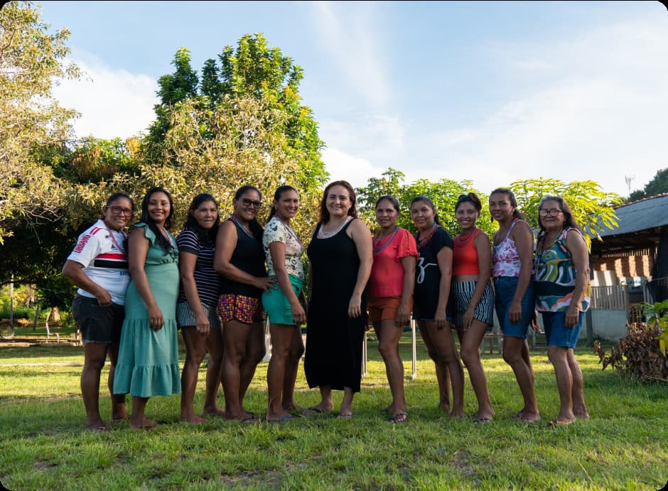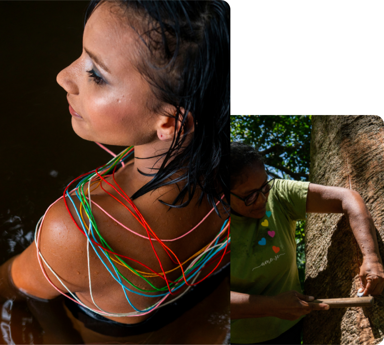 A verdadeira força por trás da Seiva Amazon Design são as artesãs ribeirinhas. Em média, 30 mulheres, residentes em 5 municípios do Pará, como Anajás, Breves, Santarém e Oriximiná, produzem as biojoias que carregam a essência da floresta. Com suas mãos habilidosas, essas mulheres transformam borracha natural e fibras vegetais em peças únicas, preservando sua cultura e gerando renda para suas famílias. Elas são as guardiãs da floresta, ajudando a mantê-la em pé através do artesanato sustentável